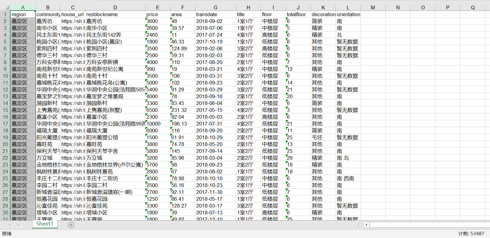 链家网 上海市 历史成交 租房数据 共计53486条数据
