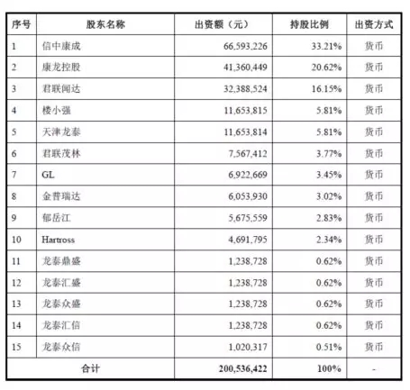 2015年9月19日,康龙有限股东作出股东决定,同意康龙有限增加注册资本人民币36,205,527元,新增注册资本由以下投资方认购: