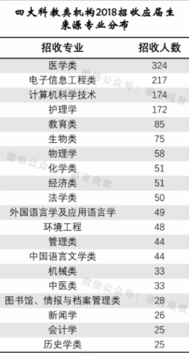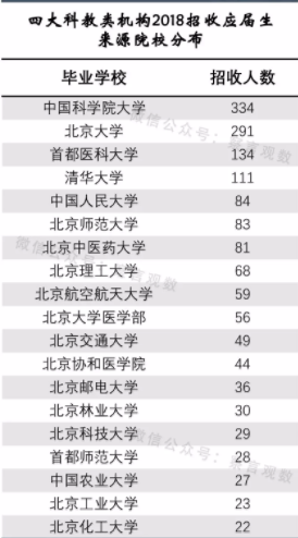 被四大部委事业单位招录的应届毕业生中,来自中国科学院大学的毕业生最多,占比达到15.3%,主要原因是中科院系统总体招录数量较大;北京大学排在第二,其毕业生广泛受到各大部委及其直属单位欢迎;首都医科大学位居第三,其护理类专业需求较大。