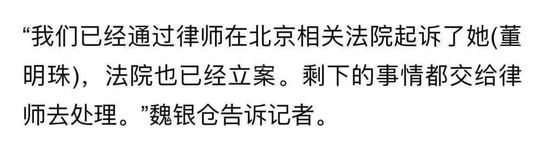 11月13日,有媒体记者联系上了魏银仓,而他则表示,“我们已经通过律师在北京相关法院起诉了她(董明珠),法院也已经立案。剩下的事情都交给律师去处理。”