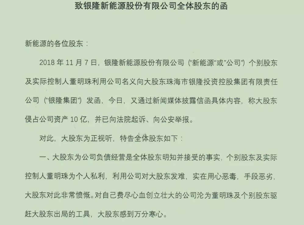 回合三:11月14日,银隆新能源再度发函称,个别股东及实际控制人董明珠为个人私利,利用公司对大股东发难。