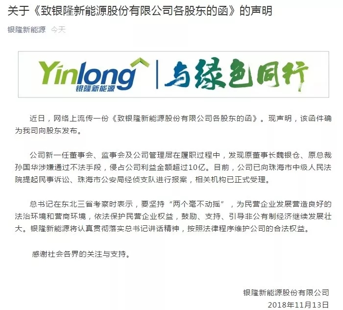 回合一:11月13日,银隆新能源在其官方微信平台上自曝家丑,称前任高管侵占公司利益超过10亿元,正在对其提起诉讼;