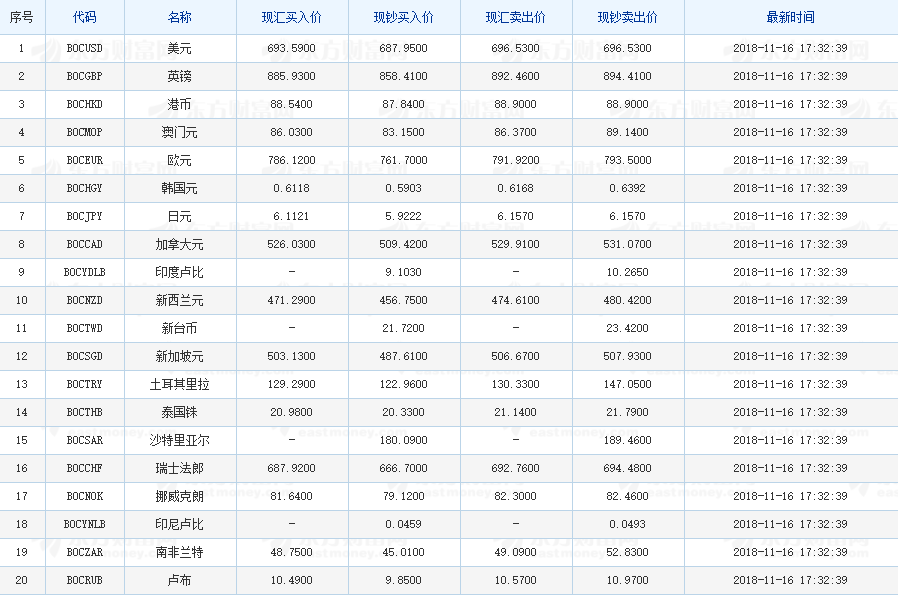 中国银行外汇牌价 2018-11-16(图片来源:东方财富网)