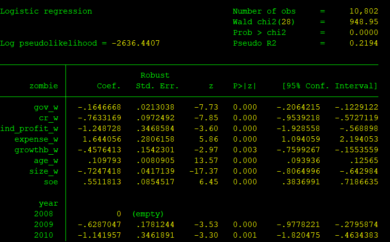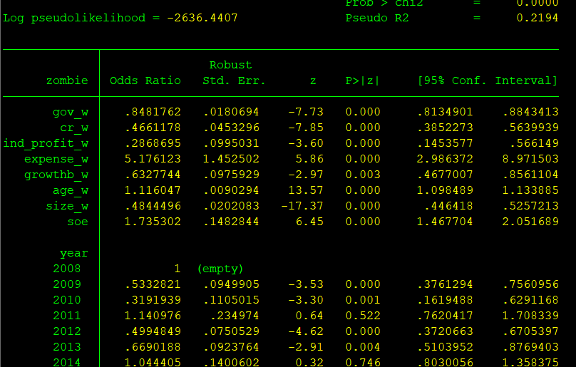 logit回归 非平衡面板 自变量gov_w是连续变量 因变量zombie是二元变量 相关系数为负,意思是不是 gov_w越大,zombie为1的概率越大?这个相关系数的数字有什么含义吗? 但是第二张图的odds ratio的比例是0.848 那这个意思不就是随着自变量的增加,因变量发生1是发生0的0.848倍吗?那这个和前面相关系数不是矛盾了吗