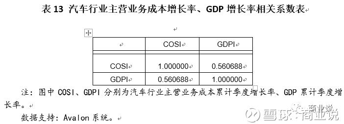 结论:汽车行业主营业务成本增长率和GDP增长率之间相关关系显著,相关系数达到0.56。