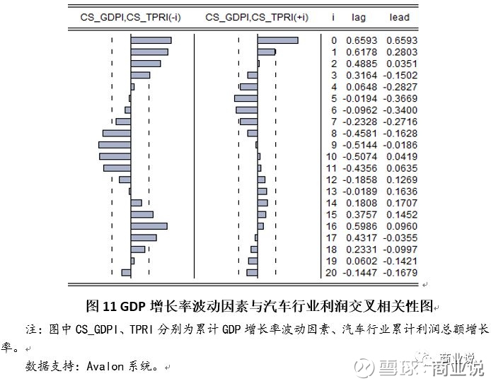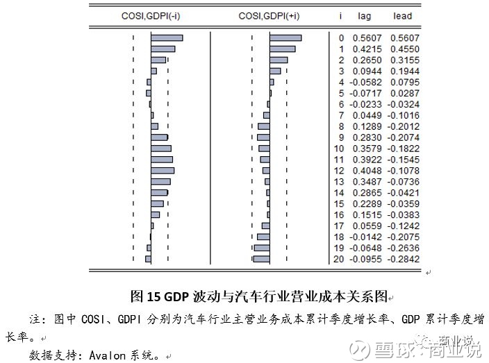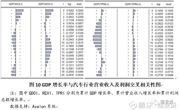 结论:将GDP增长率拆分成趋势因素和周期因素之后发现,GDP增长率周期波动对利润增长率冲击明显,当期相关度达到0.65。显示出虽然GDP增长率利润总额增长率不存在长期趋势的一致性,但是在短期波动上,GDP增长率对汽车行业利润仍构成显著冲击。
