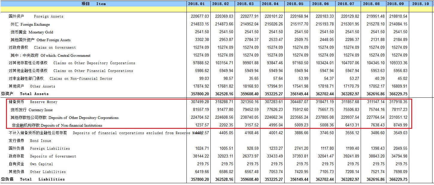 石开石 发表于 2018-11-20 20:26 所有月份都有:储备货币=货币发行+其他存款性公司存款+非金融机构存款 其中非金融机构存款是2017年才有的 ...