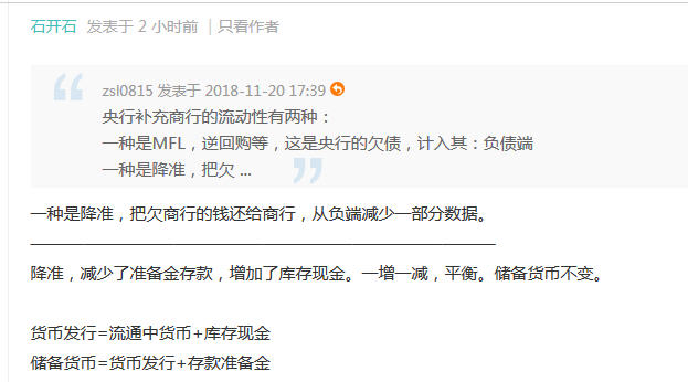 石开石 发表于 2018-11-20 21:06 商业银行的资产不变,央行的负债不变,这有那么难以理解吗? 央行货币发行是负债,央行的其他存款性公司 ...