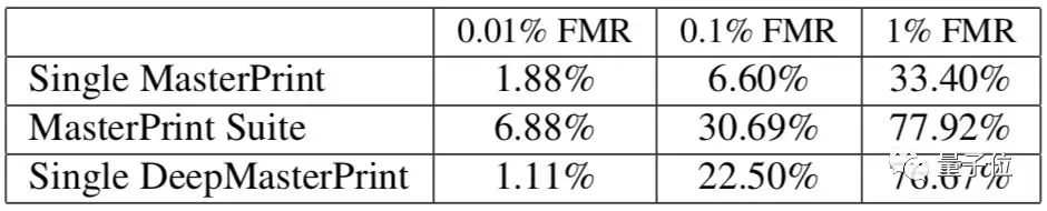 在6种不同条件的实验中,DeepMasterPrints最高的破解成功率高达76.67%!几乎是一击必杀,和之前非GAN制造的“万能指纹”几乎无差别。