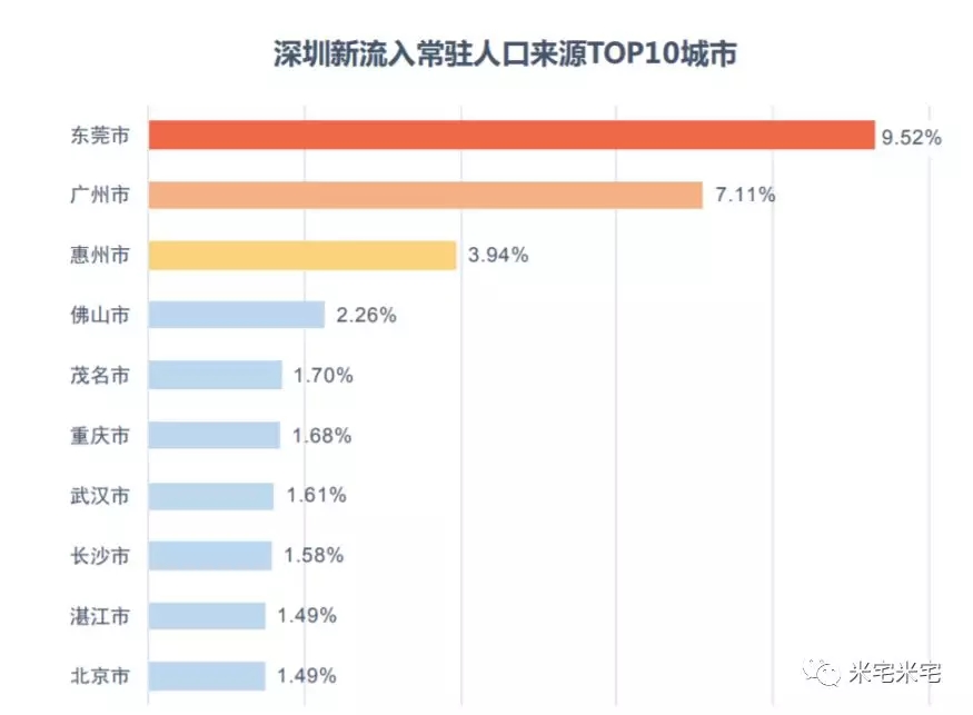再看一下,广州和深圳的人口结构区别,可以发现深圳市2017年新流入人口来源TOP10城市有6个为省内城市: