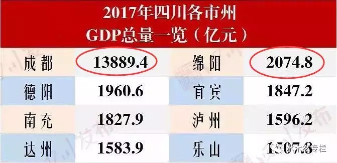 以成都为例,下面是四川各市的GDP总量的前几名,成都一个市的GDP占整个四川省的接近40%,第二名绵阳甚至不及第一名成都的零头,这就是典型的省会独大型省份: