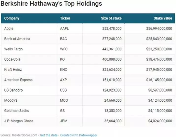 以下为伯克希尔的十大重仓股:
