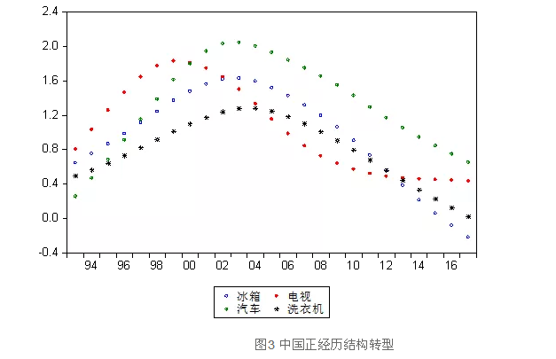 第一个事实,从增加值占比、就业占比、消费占比等多个维度看,中国正在经历从制造业到服务的经济结构转型。中国是在2010-2012年左右,经济活动开始向服务业转移,中国结构转型的轨迹与高收入国家完全一致,都是人均收入达到8000-9000国际元,工业部门增加值在GDP占比峰值达到40%左右。进入经济结构转型期以后,需求结构发生变化,工业品增长越来越落后于可支配收入增长。