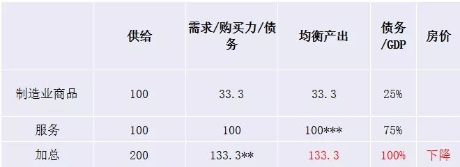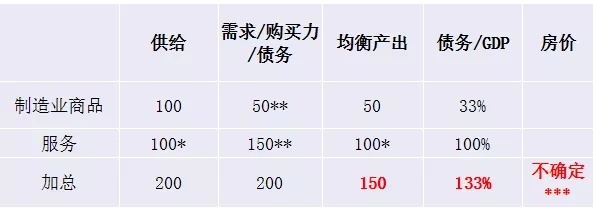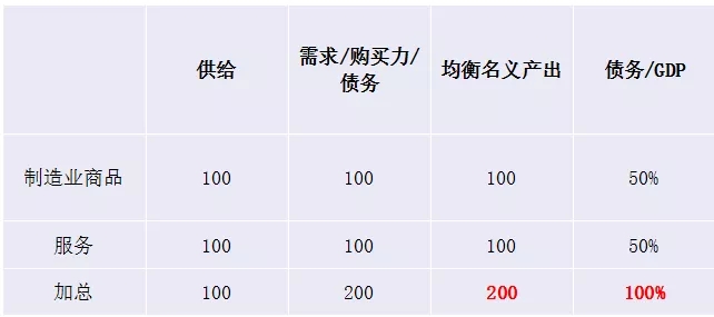 假定在结构转型之前,对制造业和服务业分别供给100个单位,对制造业、服务业的需求/购买力/债务也都是100 (购买力全部来自债务),转型之前所有的指标都是平衡的,均衡产出为200,债务率是100%。