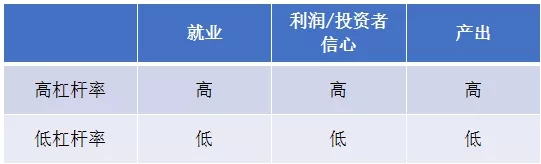 从资源利用的角度看,高杠杆的情况下,均衡产出高、就业高,投资者利润和信心较高,但是低杠杆的情况下产出远远低于潜在产出水平,并且就业水平较低。
