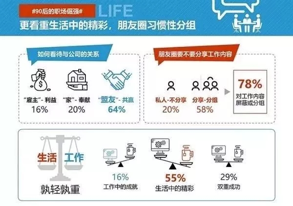 在这样的盟友关系下,年轻人如何分配工作和生活的精力,55%的90/95后认为工作不应干扰生活,相比蓬勃高涨的事业心,他们更看重的是生活中能够活得精彩。