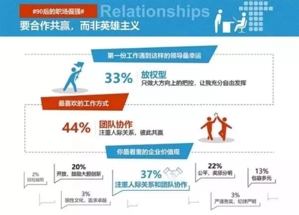 通过调研可以看出,人际关系和团队协作是如今年轻人在工作中的最大诉求,这也是他们长期浸染于社交平台和共享经济下形成的价值观与行为方式。