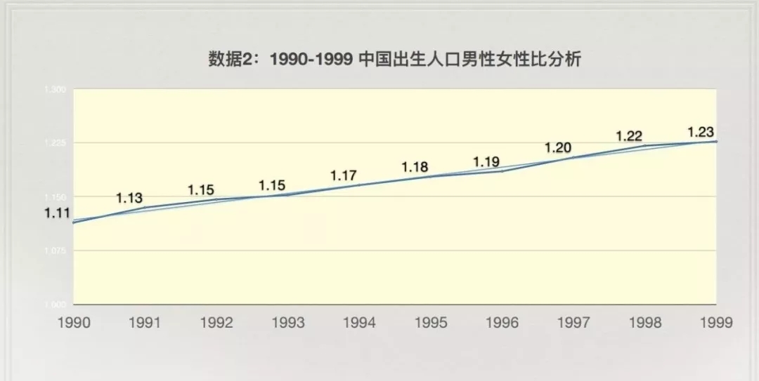 从1980年开始中国新出生婴儿103个男孩对100个女孩,1990年是111个男孩对应100个女孩,1999年达到了高峰123个男孩对100个女孩。