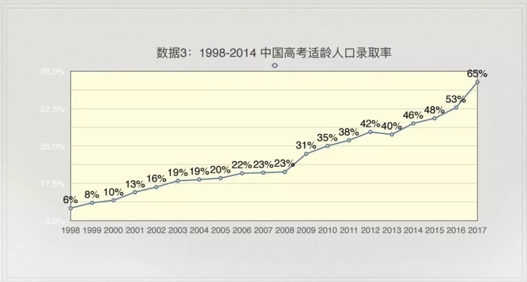 从1998年开始统计,当年100个人只有六个人可以上大学(包括大专)。去年2017年这个数字完全被反转,三分之二的人都去读大学了。