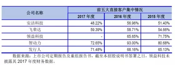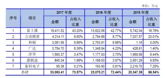 公司直接客户主要为消费电子产品制造服务商、组件生产商,产品销售给消费电子产品制造服务商、组件生产商,再由其集成后销售给终端品牌商。公司直接客户包括富士康、和硕、广达、仁宝、立讯精密、淳华、嘉联益、莫仕、信维通信、瑞声科技、歌尔股份等知名消费电子产品制造服务商及组件生产商。2015年、2016 年及2017 年,按受同一实际控制人控制的客户合并计算,公司前五大客户的合计销售收入占营业收入的比重分别为65.13%、68.16%和71.48%,其中,公司对富士康的销售收入占营业收入的比重分别为18.78%、42.77%、43.20%,客户集中度较高。