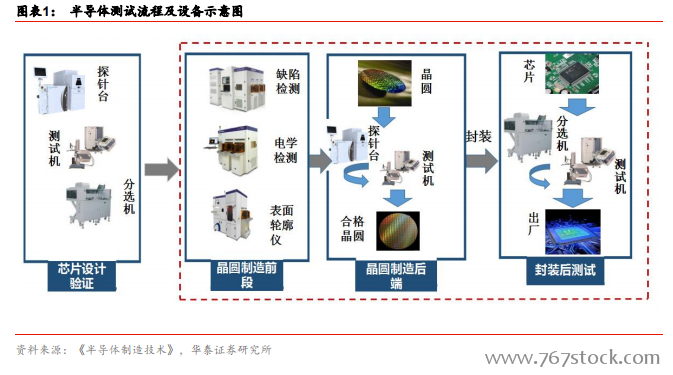 广义的半导体测试包括前道的工艺检测和中后道的性能测试。其中,前段的工艺检测偏重于从微观角度在线监测晶圆制造的微观结构是否符合工艺要求(例如几何尺寸与表面形貌的检测、成分结构分析和电学特性检测等),而中后道的性能测试主要偏重于从芯片功能性的角度检测芯片的性能表现是否符合设计要求。而狭义的半导体测试,则主要指中后道的性能测试,对应设备包括:测试机、探针台、分选机等。