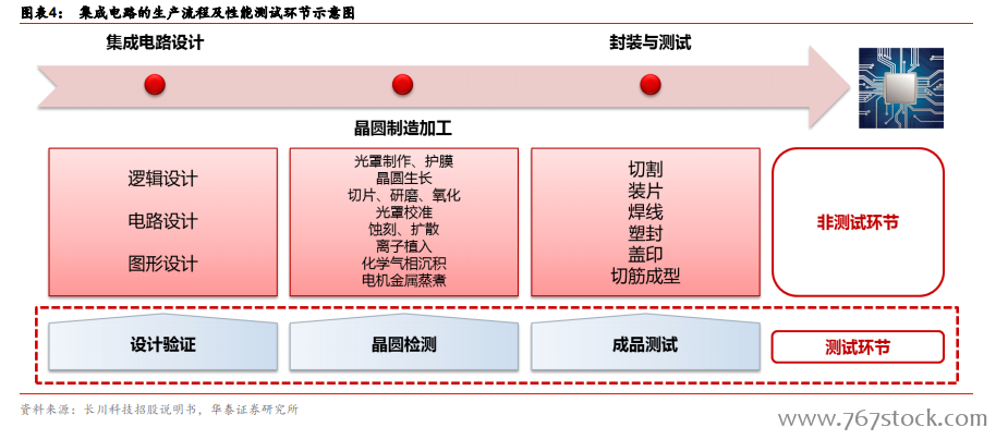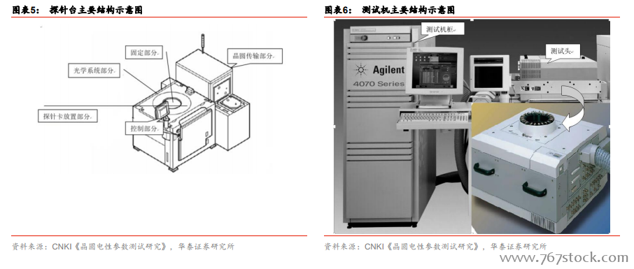 集成电路的性能测试设备主要包括测试机、分选机和探针台等。作为重要的专用设备,集成电路测试设备不仅可判断被测芯片或器件的合格性,还可提供关于设计、制造过程的薄弱环节信息,有助于提高芯片制造水平。在测试过程中探针台和分选机的作用比较相似,都是用作产品和测试机连接的媒,测试机是测试过程中最重要的装备,它的作用是判断产品参数和功能的有效性。