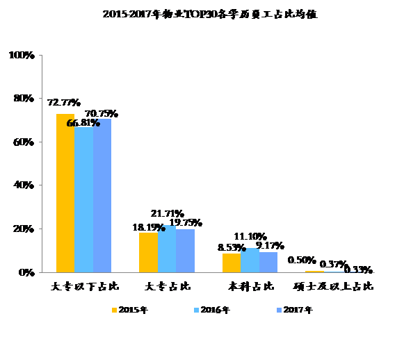 睿信地产研究院从员工学历、管理层级等维度,对TOP30的人员结构进行了深入分析。员工学历方面,TOP30以大专以下员工为主,2017年大专以下员工占比均值为70.8%,较2016年的66.8%,占比有所回升;大专员工占比均值与本科员工占比分别为19.8%和9.2%,较2016年均小幅下降;硕士及以上员工占比连续三年下降,2017年仅为0.33%。可见,物业管理作为服务行业,对员工学历整体要求不高,仍以大专以下学历为主。