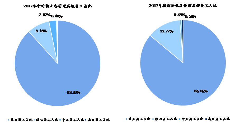 管理层级方面,行业基层员工占比达85%左右,如中海物业和招商物业2017年基层员工占比分别为88%和86%;中层员工占比约10%左右,中海物业与招商物业分别为8.5%、12.8%;而核心员工与高层管理人员占比相对较少,多在1-3%左右。