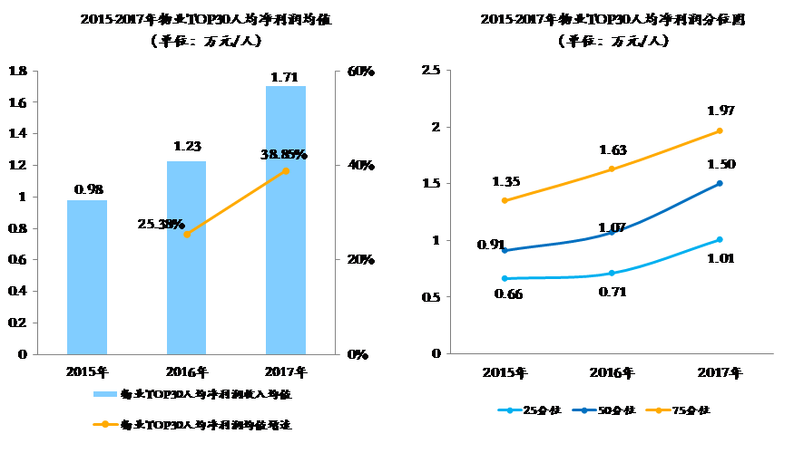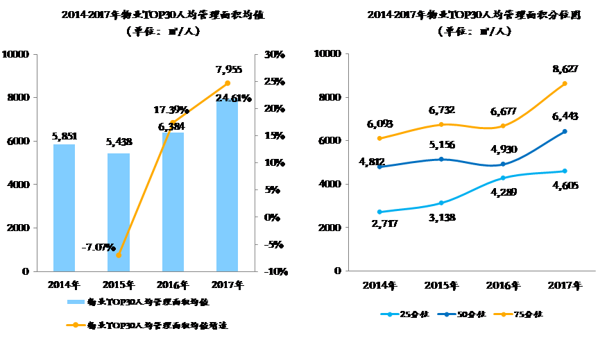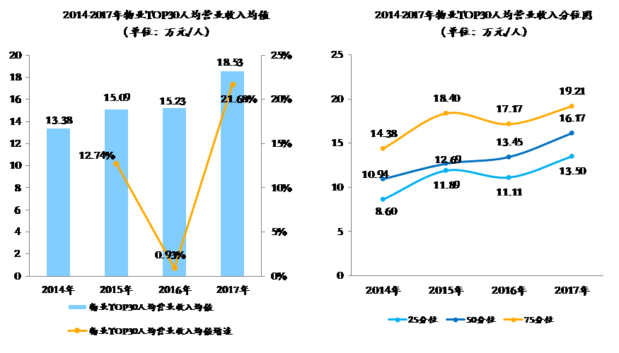效能指标主要包括人均管理面积、人均营业收入、人均物业费收入、人均净利润等指标。从人均管理面积来看,2017年TOP30的人均管理面积均值延续了近年来的上升趋势,达到7955㎡/人,增速提升至24.6%。分位数据方面,各分位数据均呈上升趋势,2017年,75分位的人均管理面积达8627㎡/人,较上年增速近30%;50分位及25分位的人均管理面积均低于TOP30的均值, 2017年分别达到6443㎡/人和4605㎡/人。