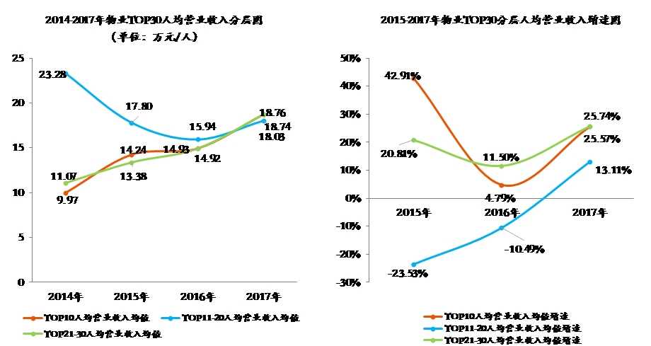 人均管理面积的分层数据方面,2017年TOP10的人均管理面积达10104㎡/人,明显高于其他层级,但增速对比上年,减少6个百分点,放缓至31.7%。TOP11-20和TOP21-30的人均管理面积稳步提升,且增速加快,分别为6675㎡/人和6472㎡/人,各层级差距进一步缩小。