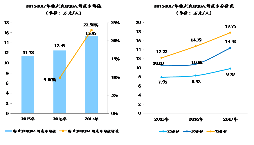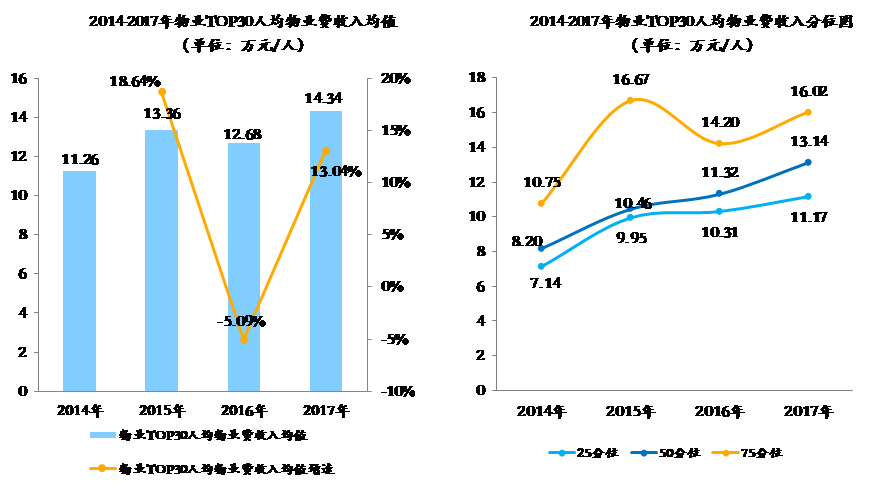 从人均物业费收入来看,2017年TOP30人均物业费收入均值较2016年有所回升,从12.7万元/人提升至14.8万元/人,为近年来最高水平。分位数据方面,75分位、50分位、25分的人均物业费收入均呈上涨趋势。其中50分位和25分位连续三年上涨,2017年分别实现物业费收入13.1万元/人和11.2万元/人;相比之下,75分位的人均物业费收入波动较大,2017年分位值为16万元/人,较上年增加1.8万元/人,但较2015年仍下降0.7万元/人。