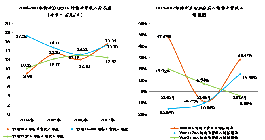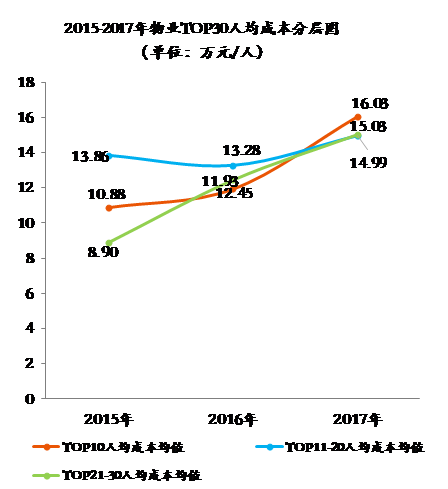 人均物业费收入的分层数据方面,近年来各层级的人均物业费收入呈现出交替上升的情况。2017年,TOP10的人均物业费收入增速大幅跳涨至28.5%,实现人均物业费收入15.5万元/人,居各层级首位;TOP11-20的人均物业费收入也以15.4%的增速提升至15.3万元/人;TOP21-30的人均物业费收入则下滑至12.5万元/人,明显低于其他层级。