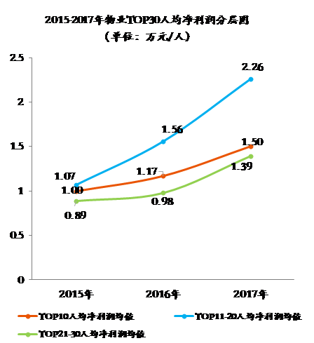 人均净利润的分层数据方面,TOP11-20的人均净利润达2.3万元/人,高于TOP30均值,居各层级首位,2016年和2017年的增速均在45%左右;TOP10与TOP21-30的人均净利润十分接近,分别为1.5万元/人和1.39万元/人,增速分别为28.2%和42.3%,较2016年均有所加快。