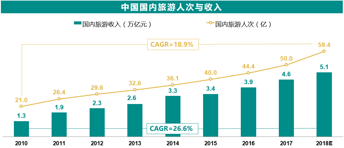 从2010年到2018年,国内旅游收入的复合年均增长率高达26.6%,预计2018年国内旅游收入有望突破5万亿大关。
