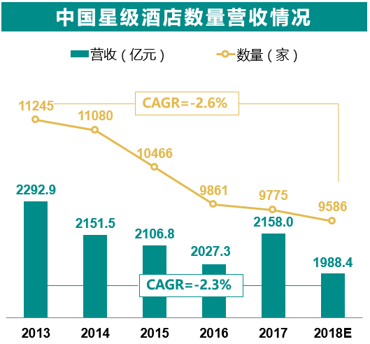 近五年来,中国星级酒店数量不断减少;营收在2017年有所增长,但整体仍呈现下降趋势。