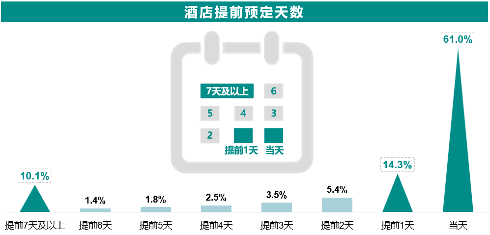大多数用户选择当天或提前一天预定酒店,仅一成用户会提前一周及以上预订。