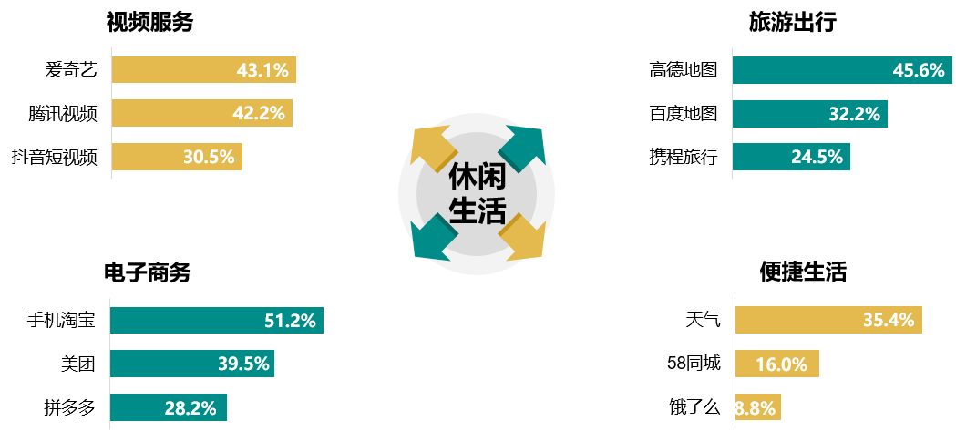 酒店用户对视频服务、旅游出行、电子商务、便捷出行等休闲生活类App触达率较高。