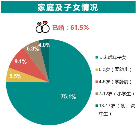 六成以上是已婚人士。大部分用户无未成年子女,占75.1%。