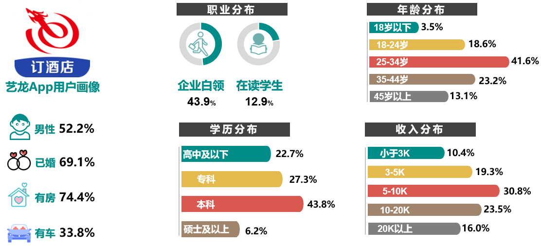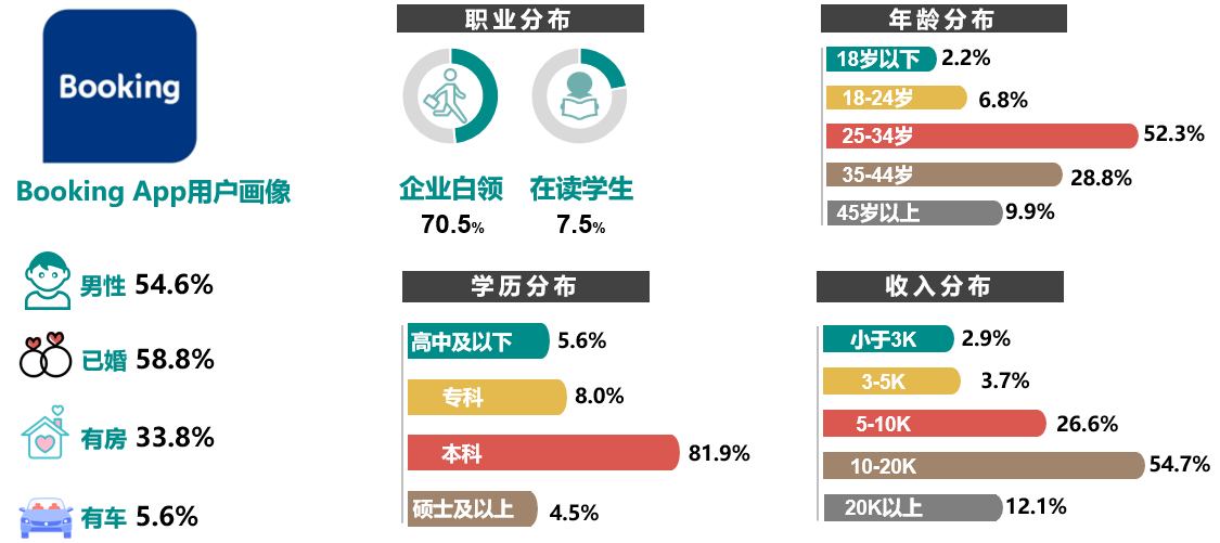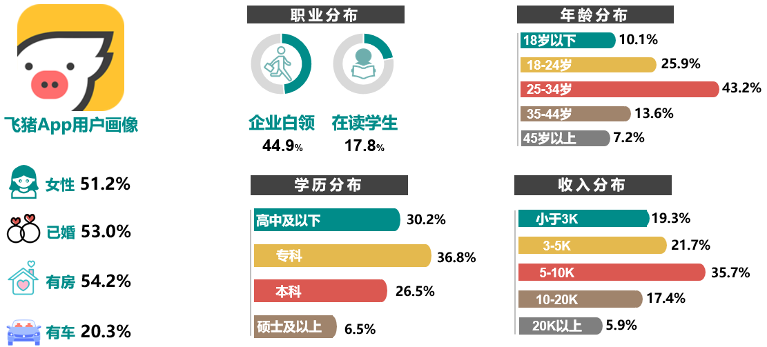 携程俘获中等收入用户,飞猪用户则多为女性,艺龙是已婚男士的最爱,Booking则是中青年白领的选择。