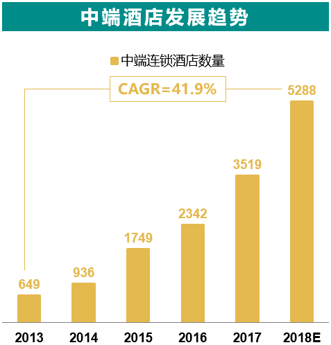 相较于经济型连锁酒店,中端连锁酒店数量略少,但近年来发展增速较为可观,复合年均增长率高达41.9%。