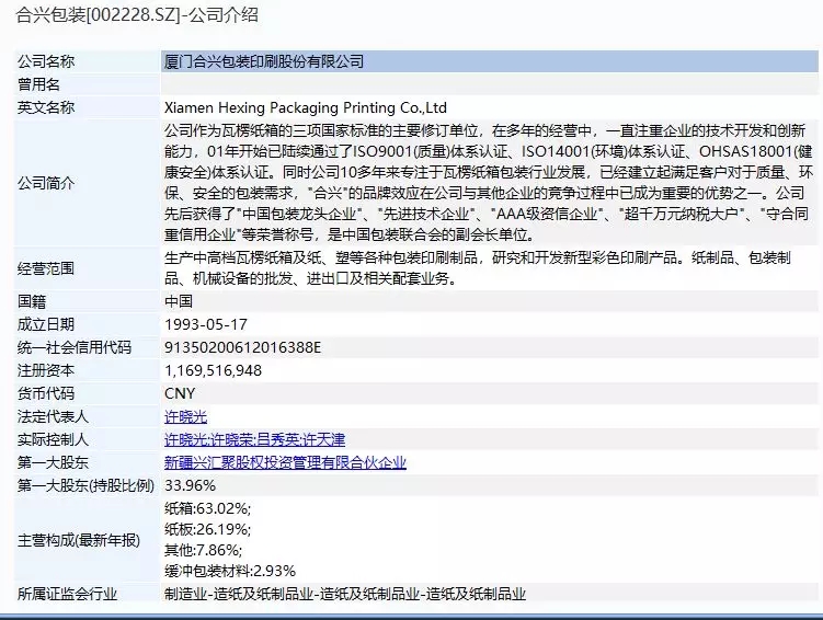 厦门合兴包装印刷股份有限公司(以下简称“合兴包装”)公司主要从事瓦楞纸箱、纸板及缓冲包装材料的研发与设计、生产、销售及服务,主要产品为中高档瓦楞纸箱、瓦楞纸板、缓冲包装材料。公司的基本情况如下: