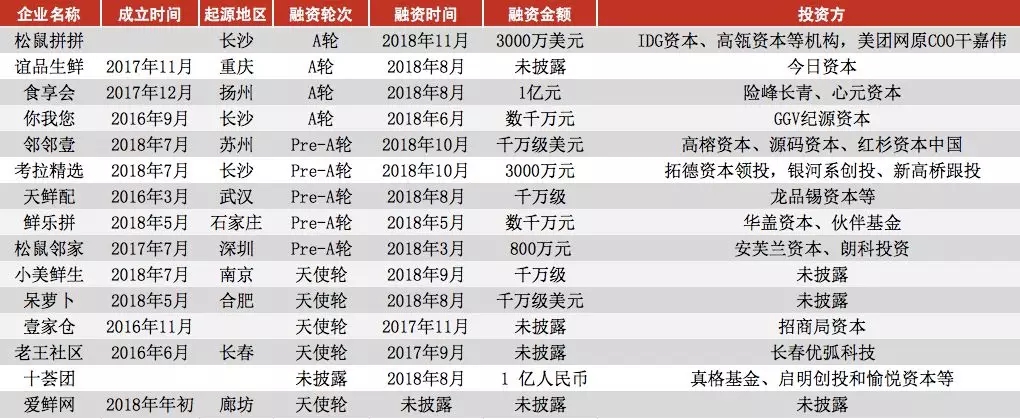 2018年8月至11月,多家社区团购公司宣布获得数千万元以上的融资。同时,腾讯、拼多多、淘宝网旗下的盒马鲜生、每日优鲜、美菜网等一批互联网行业巨头也先后入场。