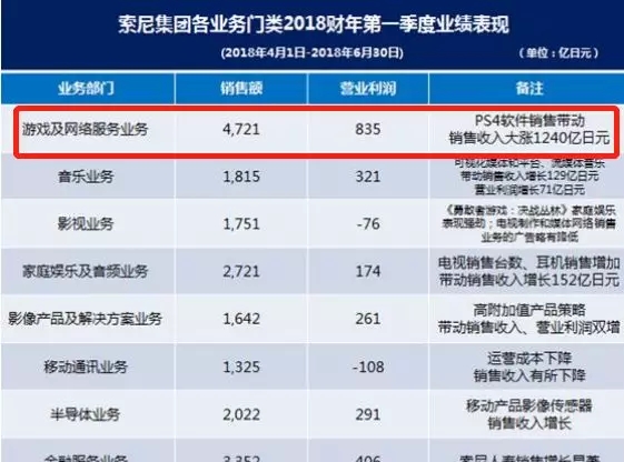 在索尼2018上半年的年财报中,仅凭一个部门一个季度4721亿日元(约289.7亿人民币),就绝杀腾讯游戏287.78亿人民币!