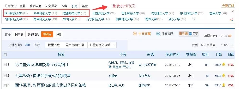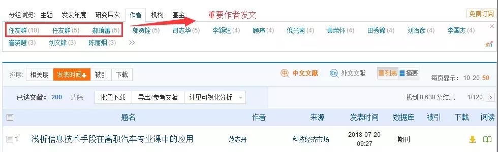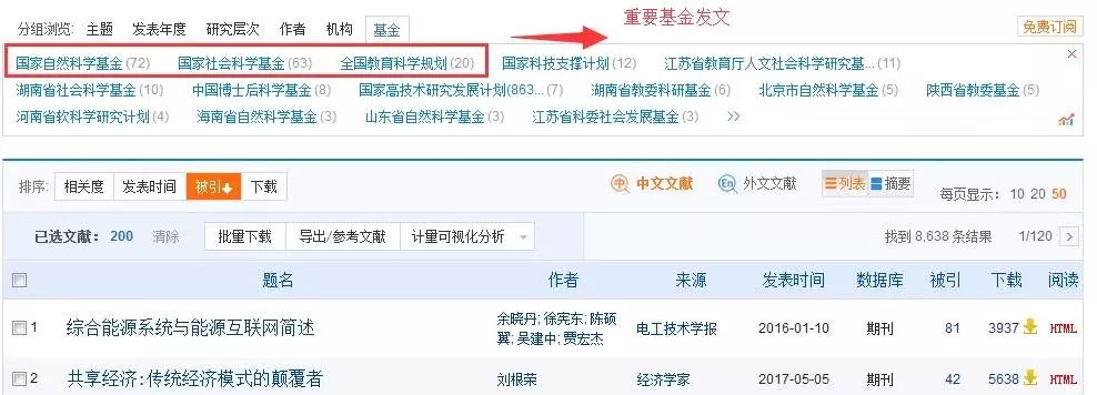 在中国知网检索结果页面,文献是按不同类型分组,小伙伴是可以通过分组浏览去获取机构、基金、读者等的文章信息。面对海量文献,不知如何下手,小伙伴不如优先关注重要机构、重要基金、重要作者的文章,选定你的阅读文献。