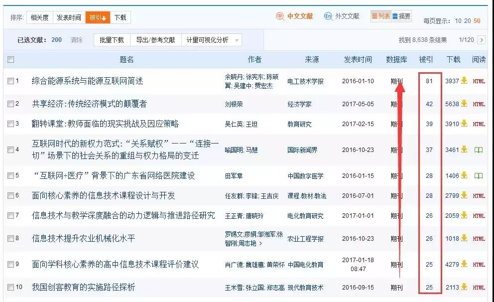 在中国知网检索结果页面,检索到大量与主题词相关的文献后,关注文章的被引频次,或者按被引频次排序查看高被引文献。一般情况下,被引频次越高文献的质量也更高。