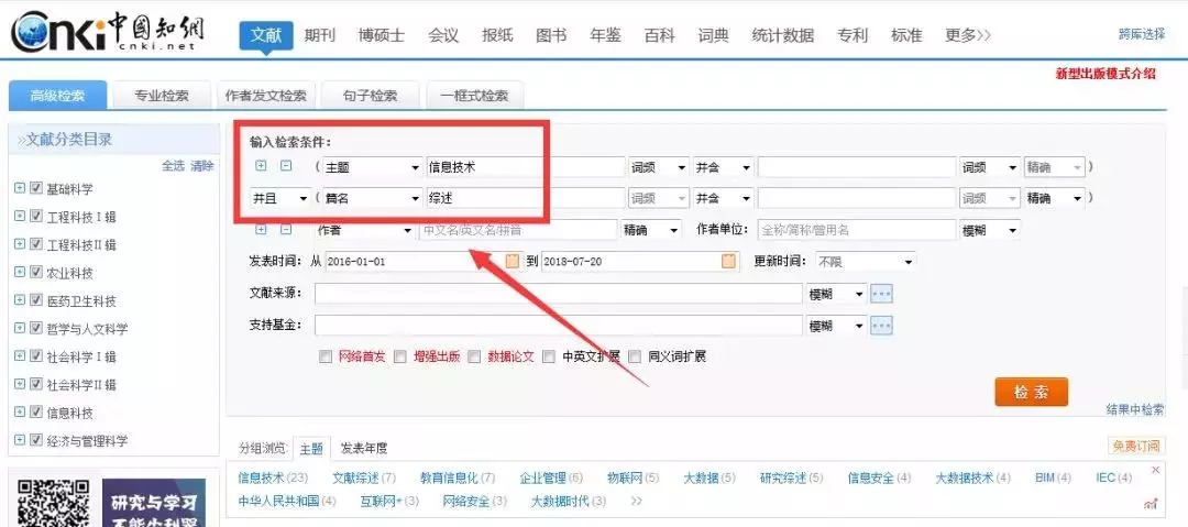 示例:高级检索主题信息技术并且篇名综述
