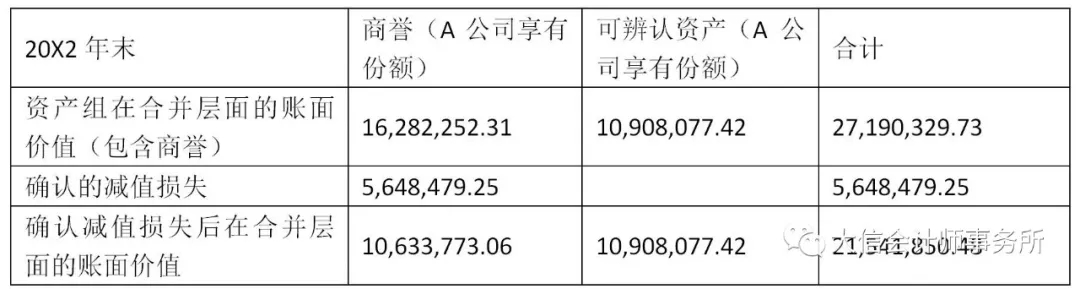 (1)评估报告显示B公司包含商誉的资产组的可回收价值为42,238,922.50元,A公司占有51%,即21,541,850.48元。然后计算对应的可辨认净资产的公允价值:在合并日可辨认净资产的公允价值比B公司个别报表账面价值增值4,755,473.06元,这部分金额(合并对价分摊)计入了资本公积。随着对应资产的折旧或摊销,每年摊销一部分金额,可辨认净资产的公允价值持续计算至20X2年末的结果为21,388,387.09元。A公司享有的份额为10,908,077.42元。