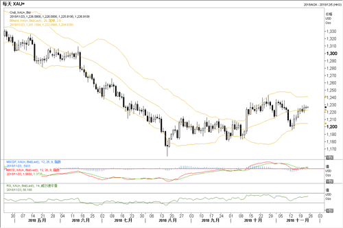昨天是感恩节,美国金融市场休市一天,黄金继续小幅上涨,收盘于1226.86美元/盎司。