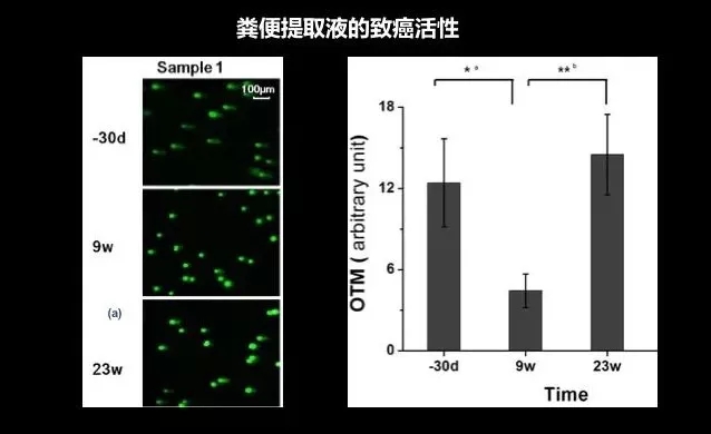 在我们严格干预让它的菌群变得比较好,9周以后,这些细胞基本保持正常,不会释放出破碎的DNA。但是后边又过了14周,我们发现致癌活性又回来了,是因为我们不再给他提供马上就可以用的产品,而是让他自己回去按照我说的先泡再蒸再煮去吃,结果估计没有多少人吃。