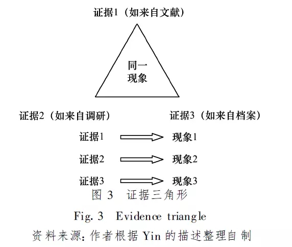 一项好的案例研究应当采取多元的渠道采集资料,需要利用多种证据共同构成稳定的、有说服力的证据三角形,其稳定性源自于多种证据来源对同一现象的多重证明,如图3所示,切记各种证据被分散,反倒降低了研究的品质。